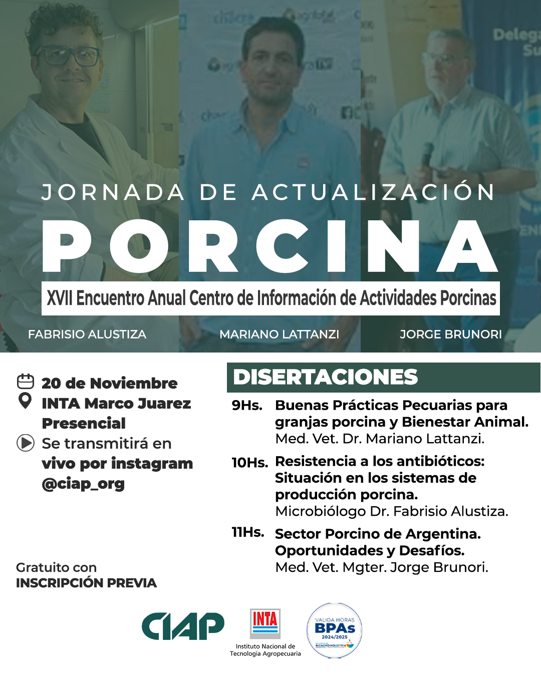 El Centro de Información de Actividades Porcinas (CIAP) y el INTA Marcos Juarez invitan a participar de la Jornada de Actualización Porcina el 20 de noviembre en la EEA INTA Marcos Juárez en el marco del XVII Encuentro Anual del CIAP.
